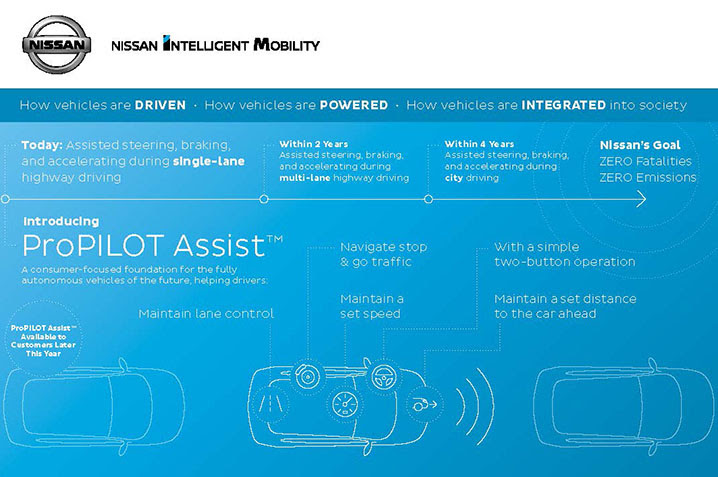 In January 2018, Nissan will introduce ProPilot to the Leaf. Throughout the rest of the decade, Nissan and its partners Renault and Mitsubishi will expand the technology to 10 models models in the U.S., Europe, Japan, and China.